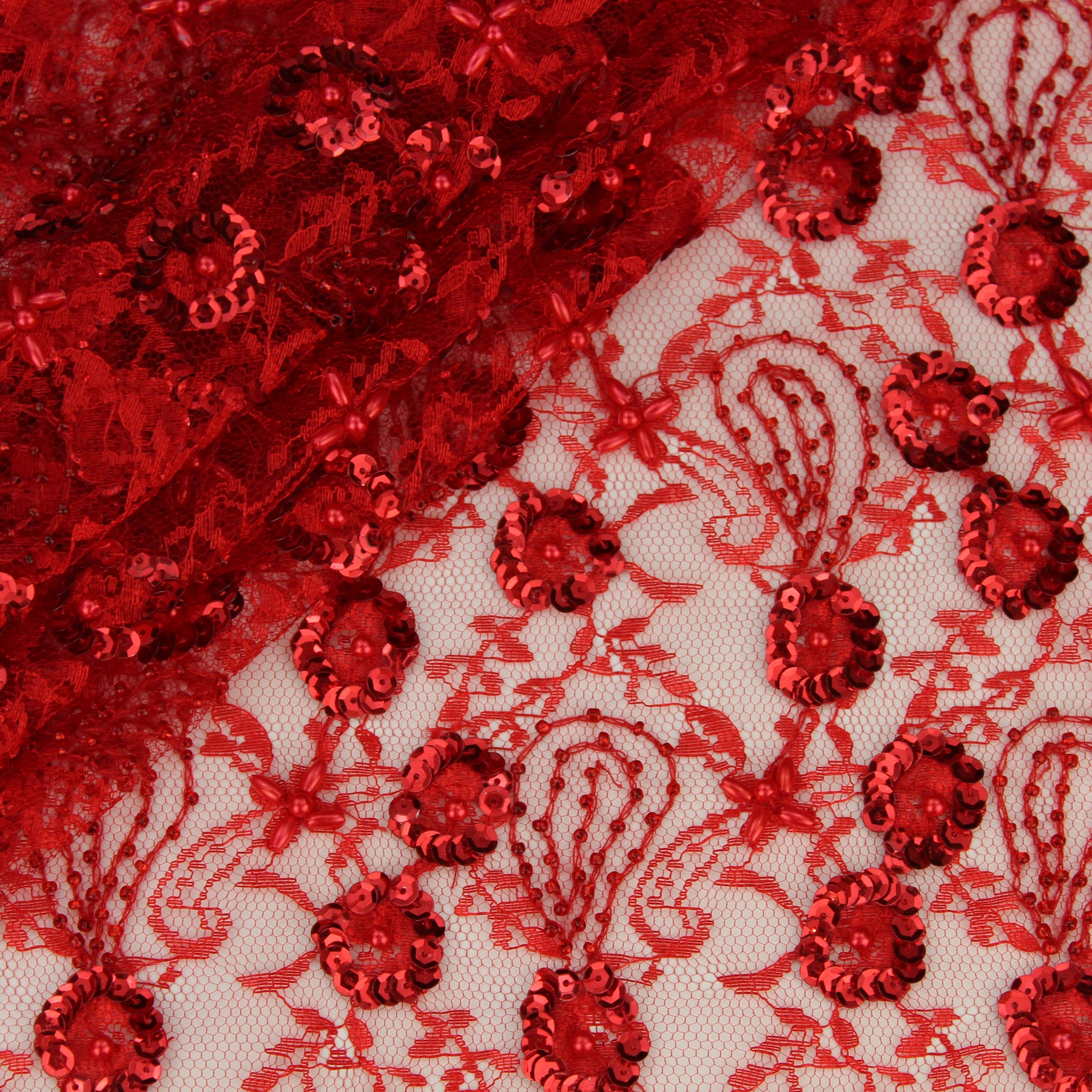 Tüllspitze, Handstickerei mit Perlen und Pailletten, einseitige Bogenkante,